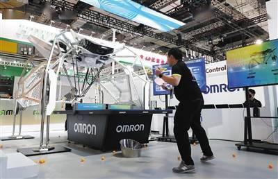11月5日,工作人员(右)在第六届进博会上展示欧姆龙公司展出的第八代FORPHEUS乒乓球教练机器人。新华社记者 方喆 摄