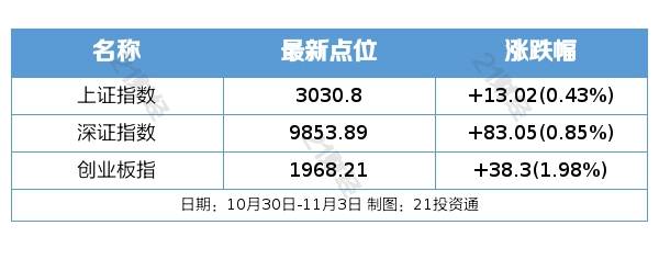 过去一周(10月30日—11月3日),A股三大指数震荡上涨。截至11月3日收盘,沪指报3030.80点,周涨0.43%;深成指报9853.89点,周涨0.85%;创业板指报1968.21点,周涨1.98%。