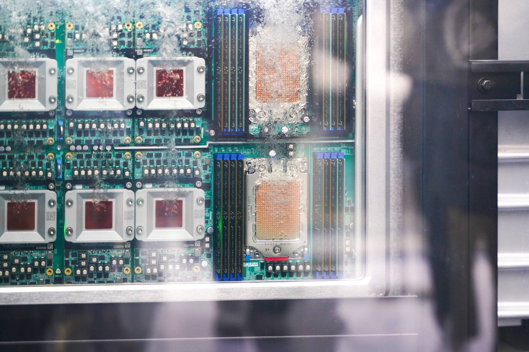 “这个是采用国际领先的浸没式相变式液冷技术的设备。”相关负责人打开超算中心的一角,向记者介绍。靠近了听,还能听到设备内的液体流动声。
