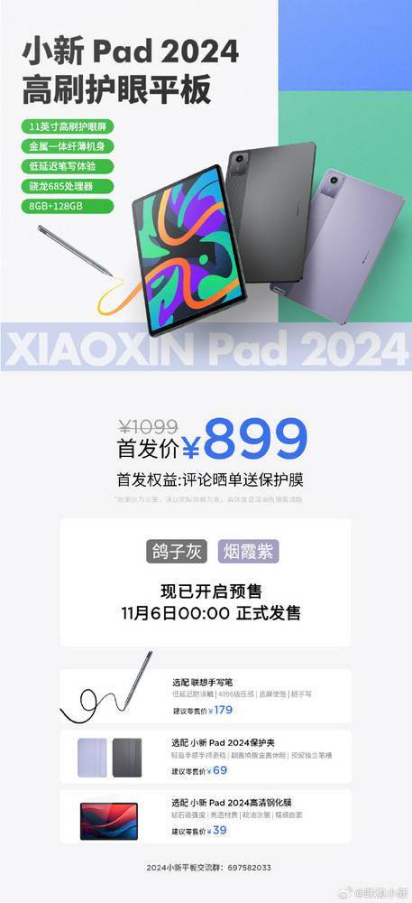 【CNMO新闻】11月6日,CNMO从联想小新官方了解到,联想小新Pad 2024烟灰紫配色明日正式开售,作为一款入门级平板,新机提供8GB+128GB版本,首发价899元。