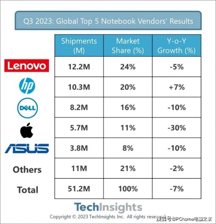 根据TechInsights的最新报告表明,2023年第三季度,全球笔记本电脑出货量总计5120万台,同比仅下降7%,这是自2022年Q1以来市场跌幅首次放缓至个位数,预示着市场整体已经企稳。