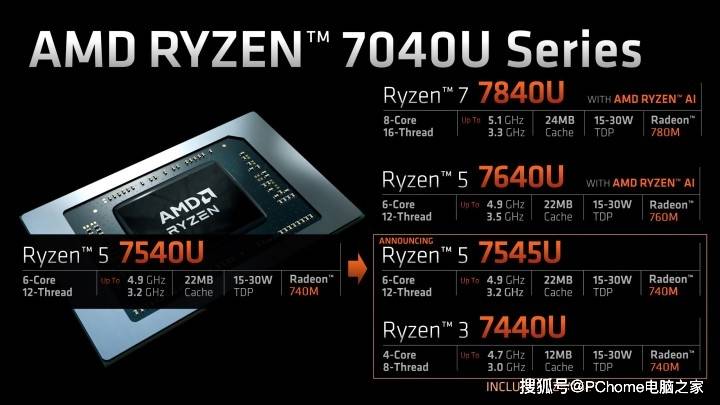 从具体产品规格上来看,锐龙5 7545U提供2个Zen 4核心和4个Zen 4C核心,组成6核心12线程,基础频率3.2GHz,加速频率4.9GHz,配备16MB三级缓存。锐龙3 7440U具有1个Zen 4核心和3个Zen 4C配置,组成4核心8线程设计,基本频率为3.0GHz,加速频率为4.7GHz,配备8MB三级缓存。这两款芯片的TDP均为15-30W,都配备了Radeon 740M核显,配备4CU RDNA 3核心,锐龙5 7545U核显最高频率为2800MHz,锐龙3 7440U则为2500MHz。
