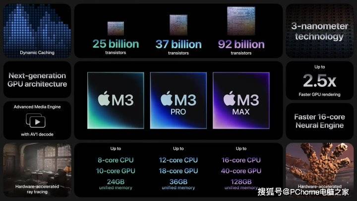 苹果上周在其“来势迅猛”主题活动上正式发布了全新一代 M3、M3 Pro、M3 Max 芯片,首度采用了3nm制程工艺,更高的晶体管密度大幅提升了性能和能效。对比前代产品,M3系列的渲染速度与M1系列芯片相比最快可达2.5倍;CPU性能核心和高能效核心比M1中的相应核心分别快30%和50%;神经网络引擎也比M1系列芯片上的快60%。苹果表示M3系列再度带来了能效飞跃。
