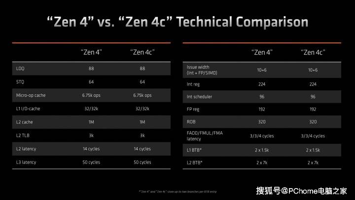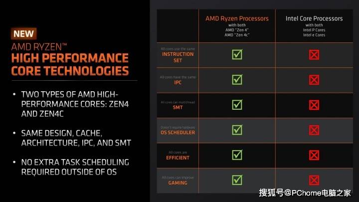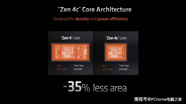 AMD表示,AMD Zen4C CCD整体核心面积相较标准Zen 4C核心面积减少了-35.4%,主要缩减在于每个核心的L3缓存从每个核心4MB减少到每个核心2MB,其余规格完全相同。这与竞争对手英特尔采用两种完全不同的核心设计的做法截然不同,Zen 4C和Zen 4使用相同的ISA并具有相同的IPC,并且Zen 4C核心仍然支持SMT(超线程/同步多线程),并在游戏中保持相同水平的性能,这意味着这种设计相较英特尔的能效核有着更好的性能表现。此外,由于这两款产品针对入门级产品的定位,AMD取消高端产品Ryzen AI单元(NPU)用以进一步节约核心面积。