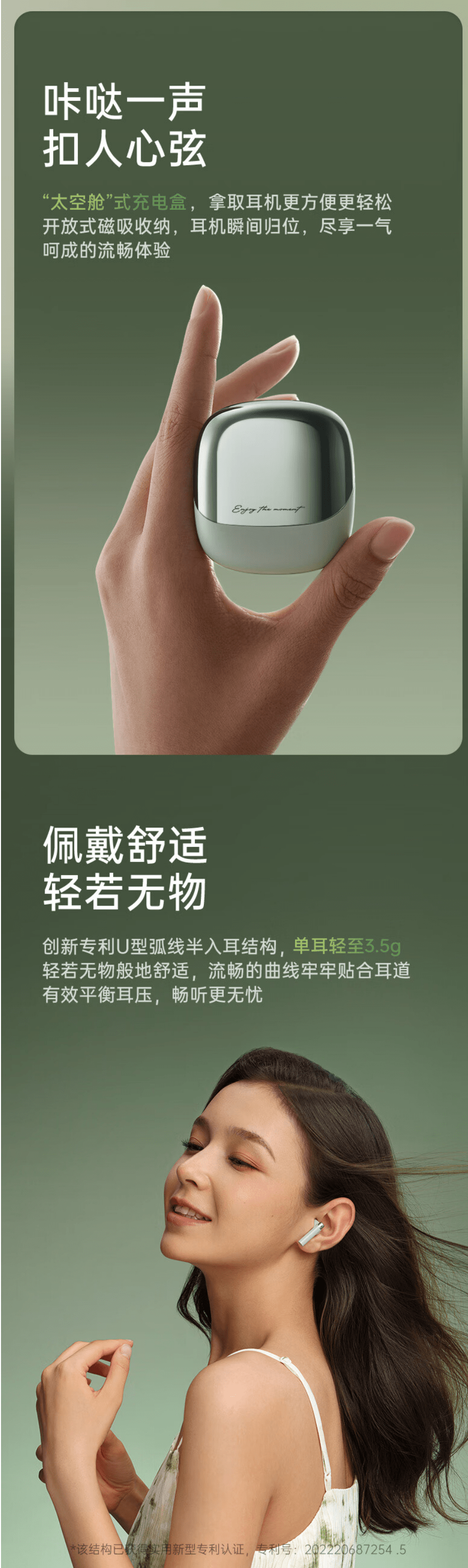 该耳机搭载蓝牙 V 5.3 芯片,游戏模式延时可低至 0.06s;采用 AI 智能通话降噪算法,大幅削减环境噪音,有效提高通话人声清晰度。