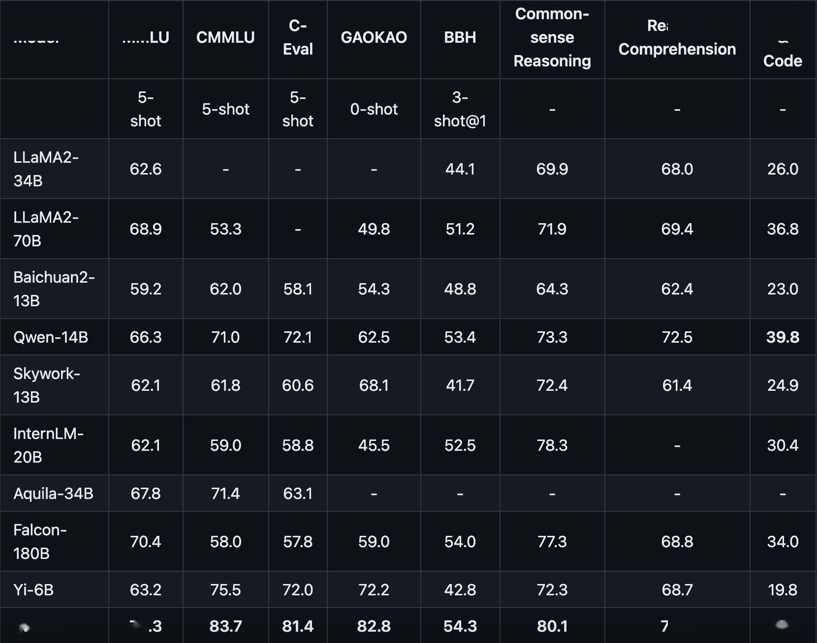 那么Yi的能力究竟几何?在测评中,零一万物参考了Meta开源模型Llama2能力测评中所用到的PIQA、SIQA、HellaSwag、WinoGrande等多个数据集,来评估Yi的“常识推理能力”“阅读理解能力”“数学与代码能力”等多维度能力。