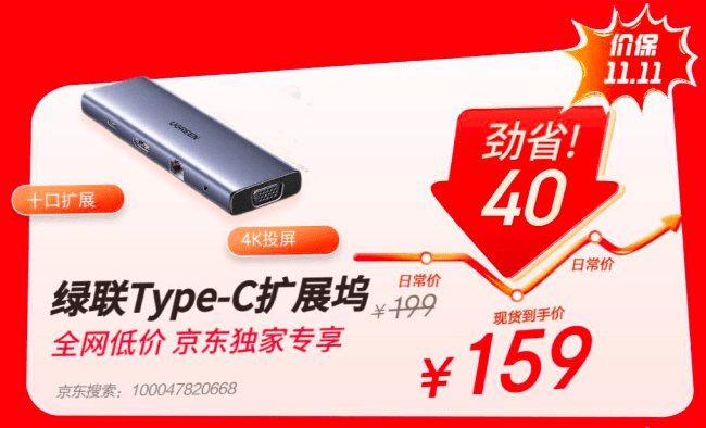而作为一位优秀的职场人,工作效率是重要的能力标准之一,工欲善其事必先利其器,很多职场人会借助强悍的配件产品来提升自己的工作效率。比如这款广受职场人欢迎的绿联的4K投屏高速传输扩展坞,它可以轻松解决超薄本接口不足的难题,外接投影大屏幕,即插即用,毫不费力,更重要的是全网低价京东专享,日常价199元现在只需159元,轻松立减40元,抢到就是省到。