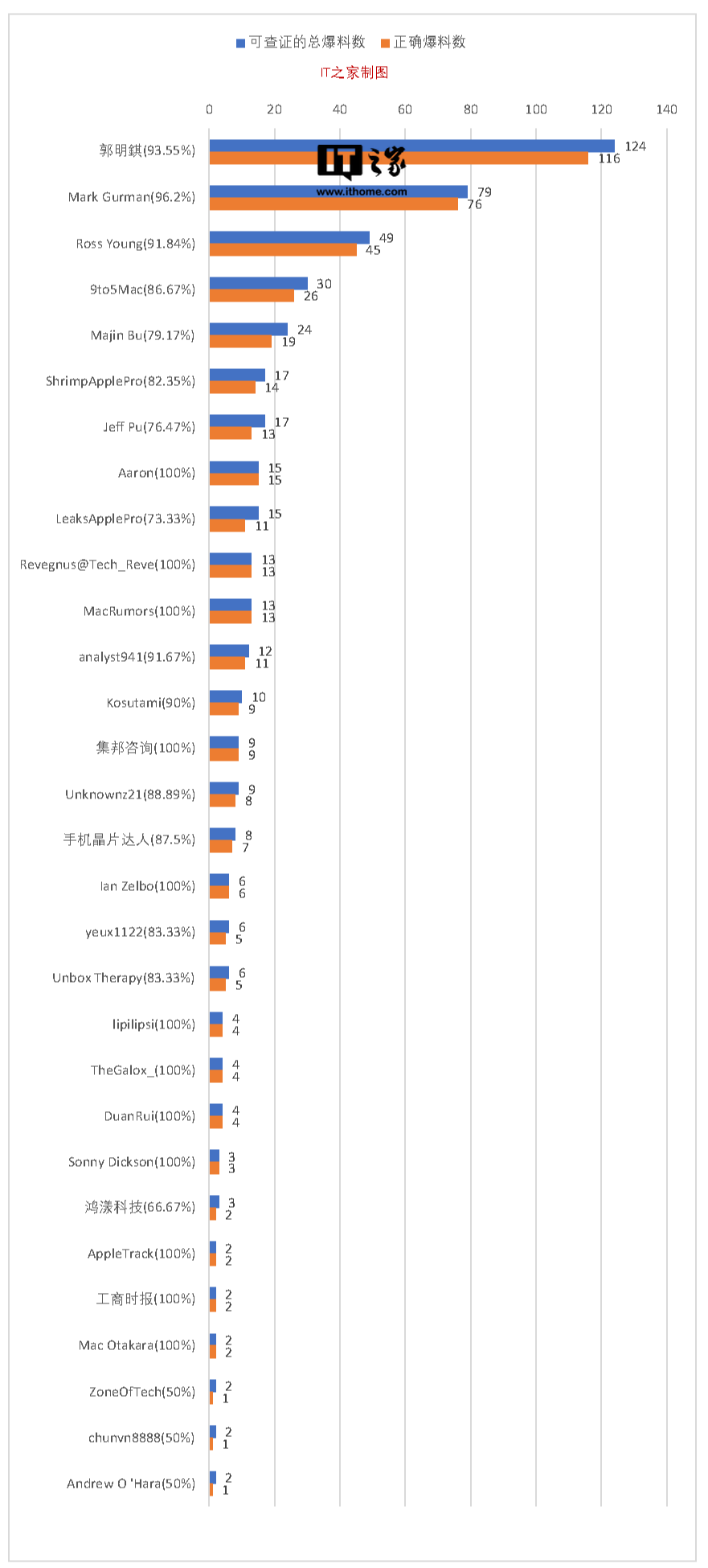 彭博社记者 Mark Gurman 共爆料 79 条,覆盖 iPhone 新机的方方面面,在硬件参数、发布会时间爆料方面都较为准确,其中正确的爆料数量为 76 条,正确率为 96.2%。