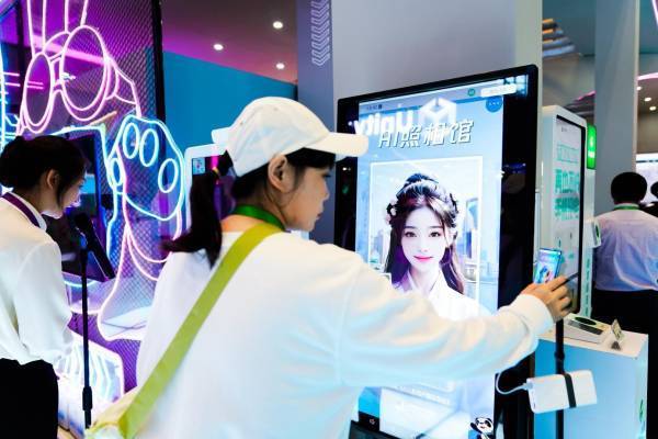 站在网红“AI照相馆”前,参观者只需要拍摄一张照片,就能通过腾讯优图实验室的人脸融合技术,体验古韵汉服漫步上海街景,或者“换上”活力文化衫打卡电竞现场,享受沉浸式互动体验。