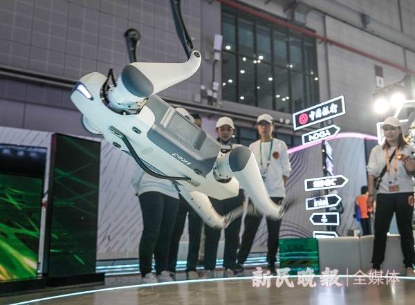 图说:四足机器人Lite3通过灵巧跳跃、语音互动、人体跟随与导航避障等展示了先进的运动能力与AI感知能力 新民晚报记者 陈梦泽 摄 (下同)