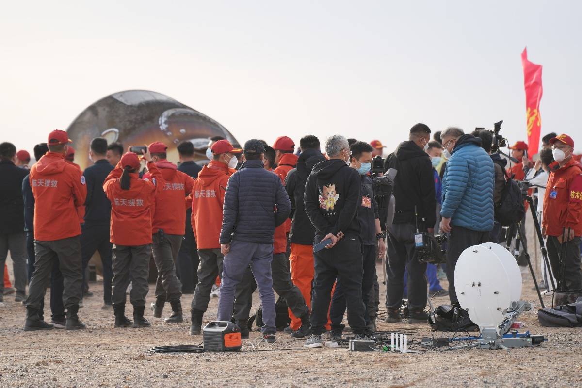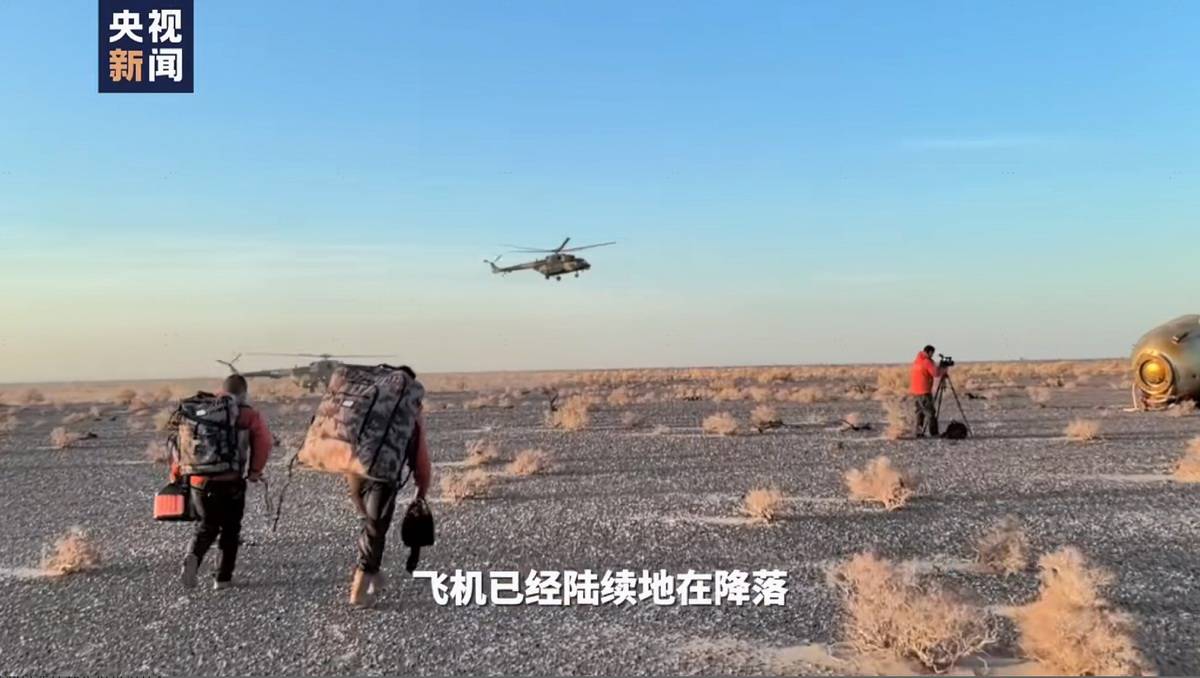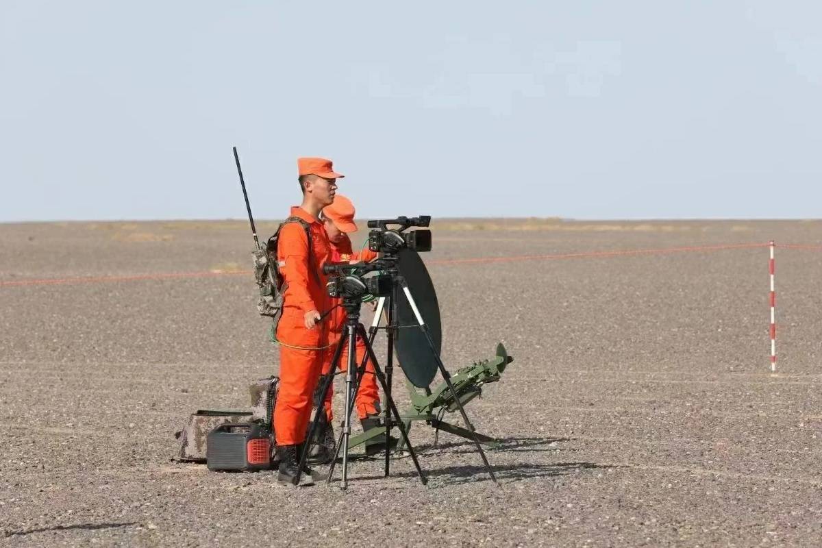 央视新闻频道提供的画面中,空中救援力量已到达现场,两名“全副武装”的地面搜救队员迅速奔向返回舱,可以看到其中一人背着卫星通讯设备,另一人则拿着橙黑色的户外电源,为迎接航天员出舱做好准备。