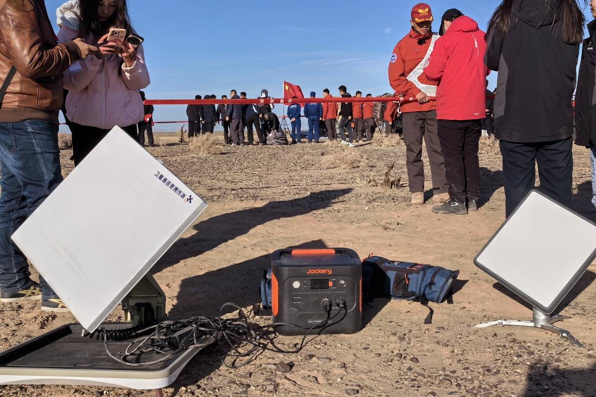从图片可见,在搜救大部队到来时,卫星基站、WiFi 路由、摄影机等器材已全部展开投入工作状态,Jackery 电小二户外电源正为它们提供电力,让电视机前的大家实时观看航天员出舱动态,牵动着全国所有观众。