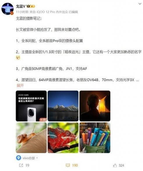 据最新消息,即将发布的iQOO 12系列手机不仅性能强劲,影像方面也有不少亮点。新款 iQOO 手机将搭载高通最新的骁龙 8 Gen3 处理器,并且配备 Pro 级摄像头配置。主摄为全新的 1/1.3 英寸暗夜追光主摄,超广角采用 50MP 高像素 JN1,支持 AF。此外,还将配备 64MP 高像素潜望式长焦镜头,这是行业内第一款拥有潜望长焦的骁龙 8 Gen3 旗舰机型。戈蓝 V 表示这些配置都会在 iQOO 12 系列上全系搭载,Pro 版比友商的配置更高。