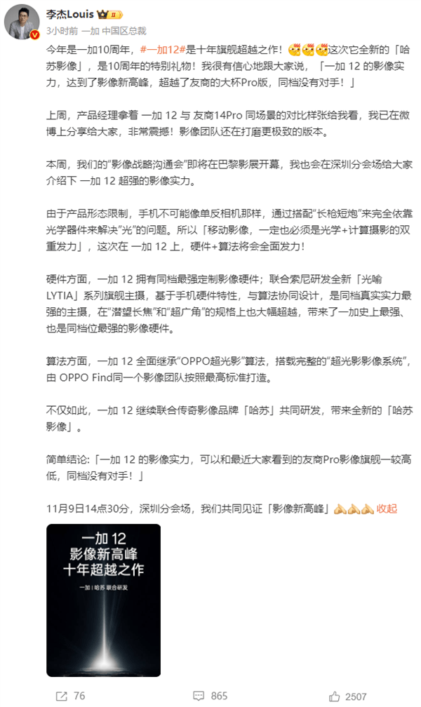 李杰表示:“我很有信心地跟大家说,一加12的影像实力,达到了影像新高峰,超越了友商的大杯Pro版,同档没有对手”。