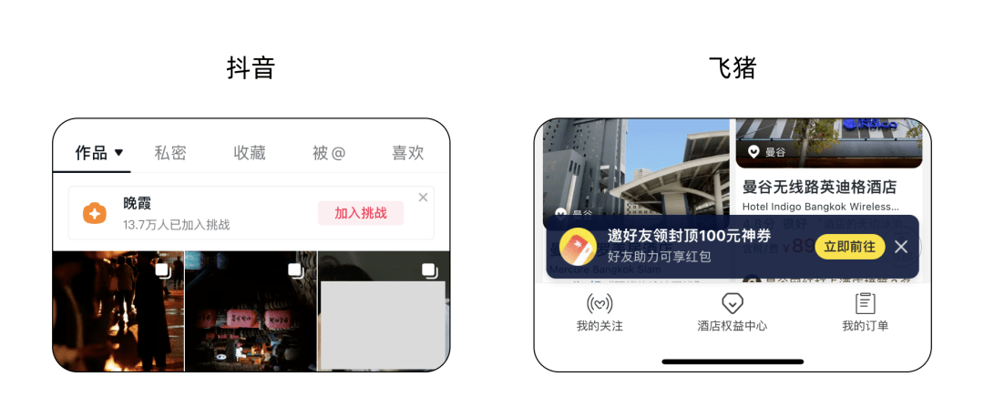 这一类提醒主要是为了提高用户活跃度,增强用户留存、提高下单率等。比如飞猪底部的签到活动、邀请好友活动、抖音中提醒用户参与主题活动的提醒等。