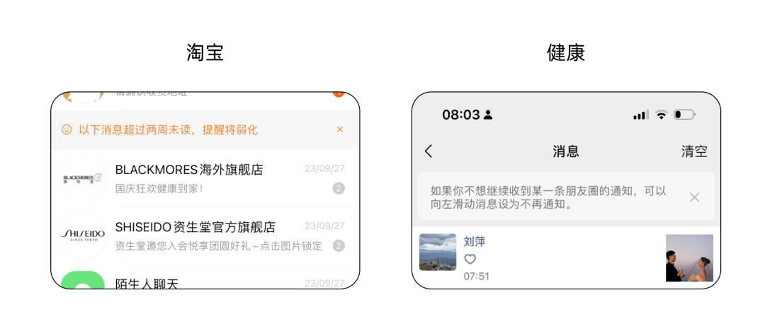 当功能有差异或者提前预测用户行为路径后需要主动告知用户相关功能的提醒。比如淘宝消息视觉呈现上会有差异,使用通告栏告知用户差异原因。