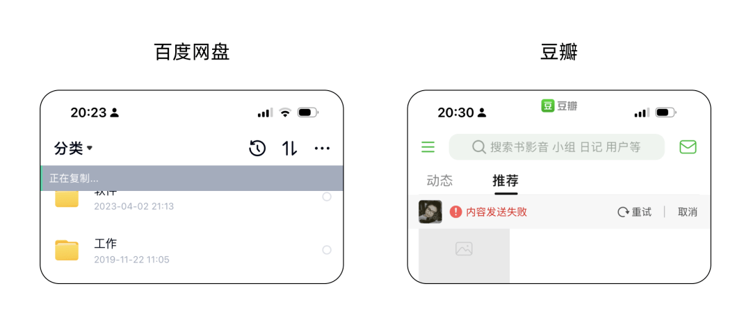 豆瓣也是类似的设计,会展示发布中和发布失败,但对于发布成功则使用了 Toast 。我觉得这里是合理的,对于这种轻量级的成功反馈使用 toast,也可以保持产品一致性。