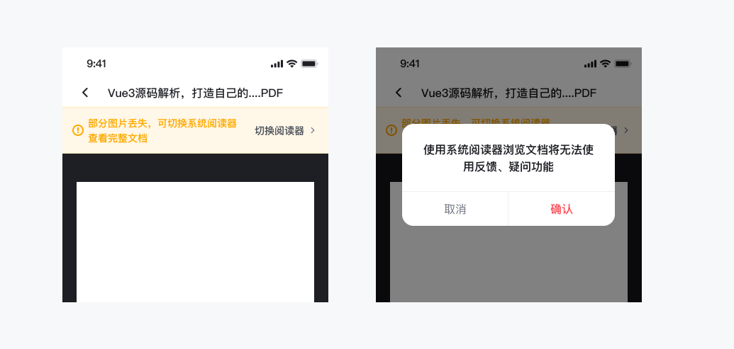 我们的问题是这样的,用户使用我们的app打开附件时,由于附件内图片质量过大等其他问题可能会导致附件图片丢失。如果用户想要查看完整附件,可使用系统自带阅读器查看,但系统阅读器存在限制,无法使用 app 原有功能。所以希望在预览附件时提供用户切换系统阅读器查看完整附件,并且告知用户切换后哪些功能将无法使用。
