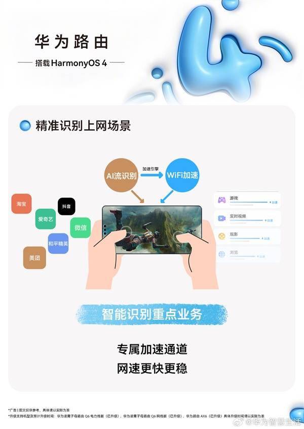鸿蒙4的智能技术,能识别用户上网使用场景,并对购物、短视频、游戏、社交等场景进行专门传输优化。