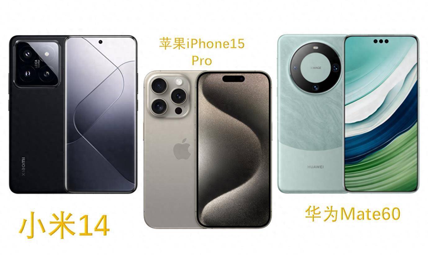 当前最为火爆的三款手机,分别是苹果iPhone15、小米14、华为Mate60。