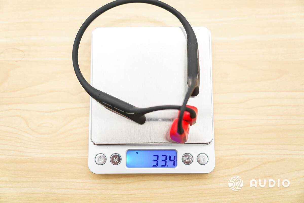 我爱音频网采用高精度秤对颂拓 Suunto Wing 进行了称重,测得耳机的实际重量为 33.4g,为后挂形态骨传导耳机的主流水平。