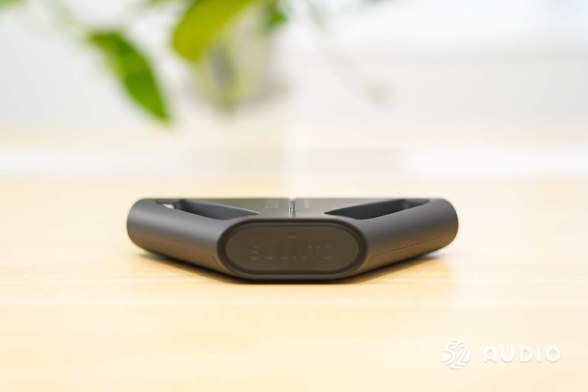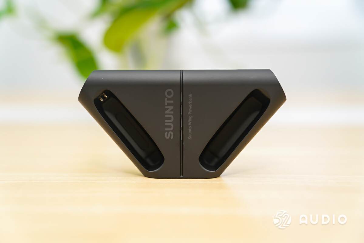 Suunto Wing 移动电源(充电盒)一览,采用三角型设计,内设置两个凹槽,右侧凹槽则设置充电触点,和耳机本体两侧的控制区域底部相对应。