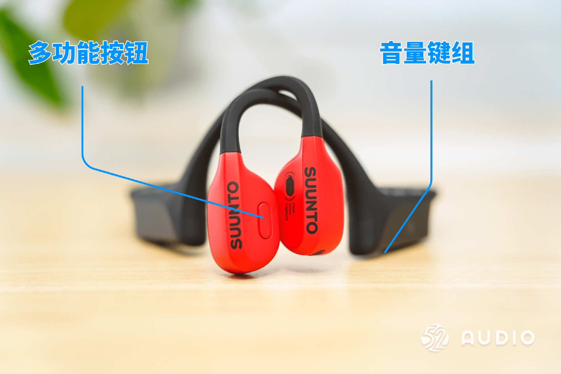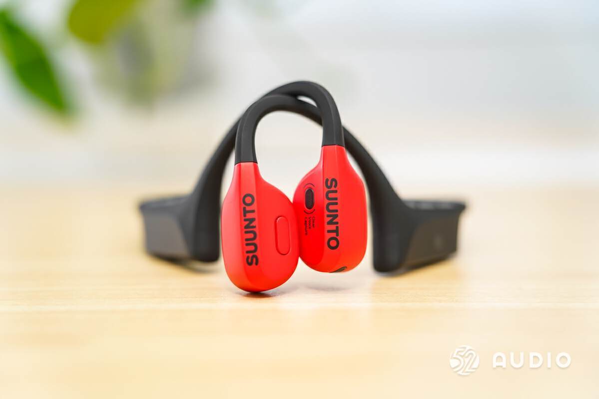 发声单元位置一览,设置有颂拓 Suunto 的 logo,右侧设置拾音麦克风,左侧设置一个多功能按钮。