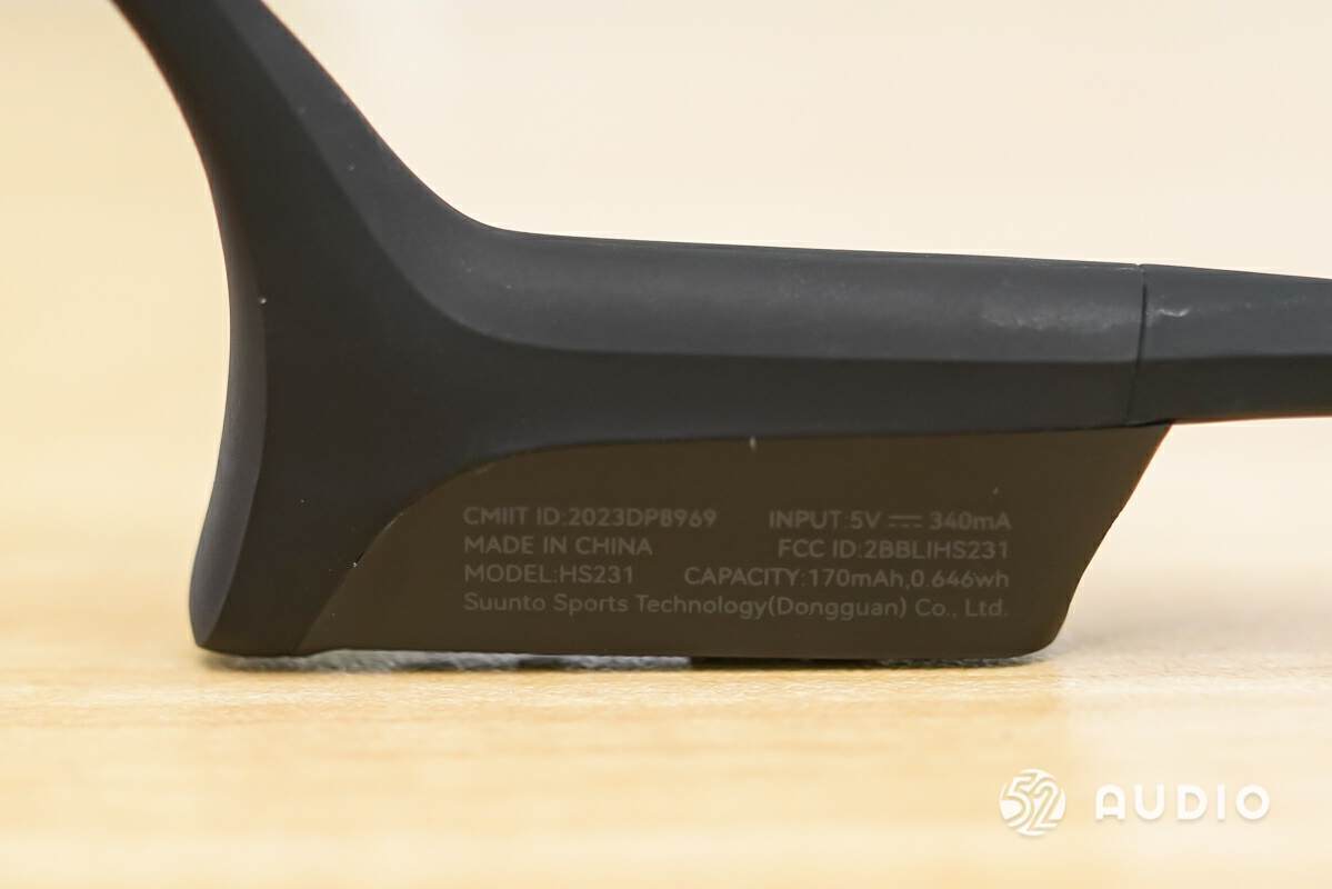 右侧控制区域内侧标注了耳机的技术参数信息。信息可见,Suunto Wing 的型号名称为 HS231,输入为 5V/340mA,电池容量为 170mAh,0.646wh。