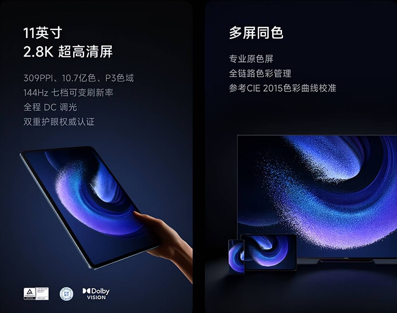 屏幕为11英寸LCD屏, 2880x1800分辨率,最高144Hz高刷,支持七档可变刷新率,全程DC调光,有双重护眼认证。具有DCI-P3色域,全局最高亮度550nit。后置1300万像素摄像头,前置800万像素摄像头。