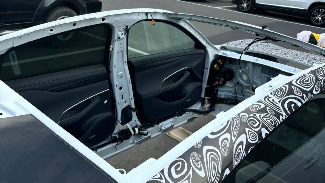 老实说,从白车身来看外观设计,并不会得到什么太多有用的信息,实属管中窥豹。但如果去判断车辆结构的话,那么观察白车身将会是最好的办法。首先从透露出的车顶照片来看,小米新车使用超大的全景天窗设计,其中天窗尾端几乎与后窗玻璃相连,预计天窗会延伸到第二排乘客的头顶后方位置,并大概率不配置遮阳帘。