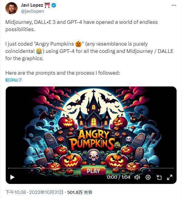 《Angry Pumpkins》制作者Javi Lopez解释了他们制作的方式,利用GPT 4进行所有的编程工作,而DALL-E和Midjourney负责处理图形效果。