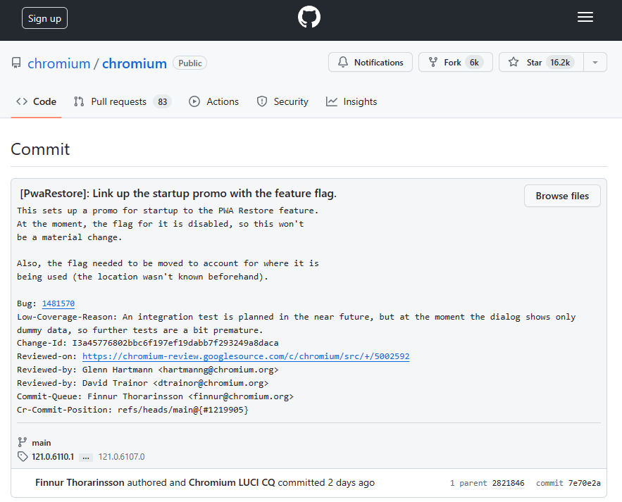GitHub 上的提交内容是这样描述的:“当我们检测到用户更换了新设备,且在旧设备上留下了 PWA 应用时,就会运行 PWA 还原功能。该功能的理念是,用户可从旧设备恢复此前安装的 PWA 应用。”