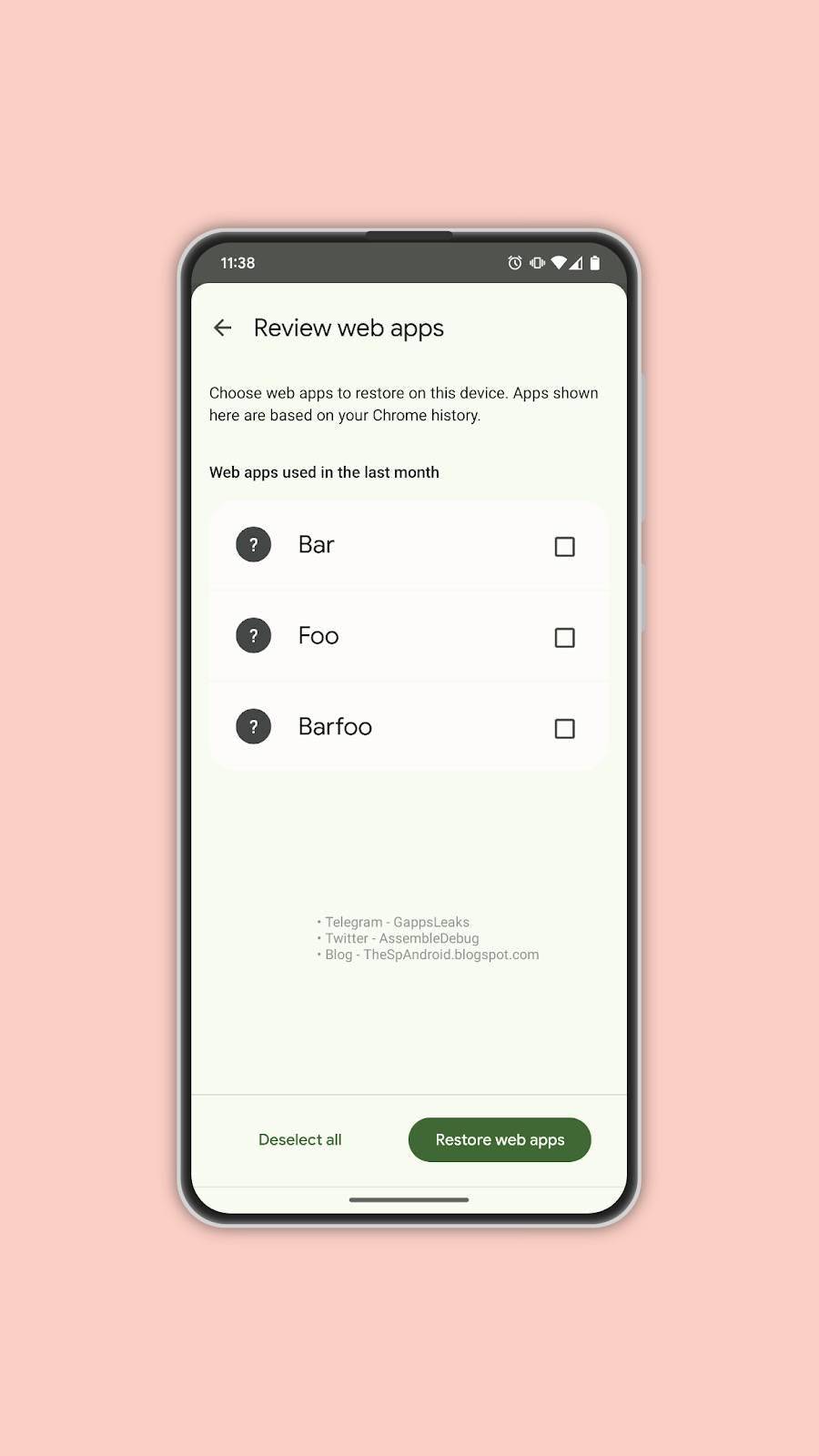 TheSpAndroid 提供了两张截图,显示在新设备的 Chrome 浏览器中列出了用户之前安装的 PWA 应用,用户可自行选择是否在新设备上还原。