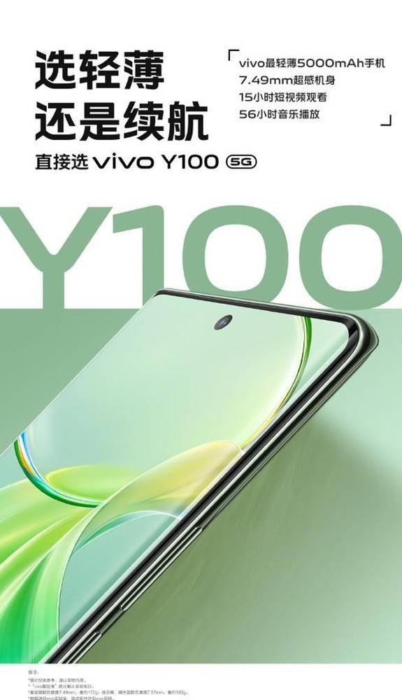 vivo Y100“星夜黑”版在薄至7.49mm、轻至172g的机身中塞入5000mAh,是同价位最轻薄的5000mAh超大电池5G智能手机;采用3D双曲面玻璃后盖的“琉云青”和“璃光蓝”厚度也仅为7.57mm,重183g。在做到全系轻薄大电池机身同时,vivo Y100以“灵动越级”理念演绎东方美学,带来云羽纹理萤石AG磨砂玻璃后盖的“琉云青”、双倍增厚纳米级瓷釉质感镀膜玻璃后盖的“璃光蓝”、抗指纹脏污纳米级镀膜流沙质感板材后盖的“星夜黑”,三大配色让不同的消费者都能找到情之所钟。