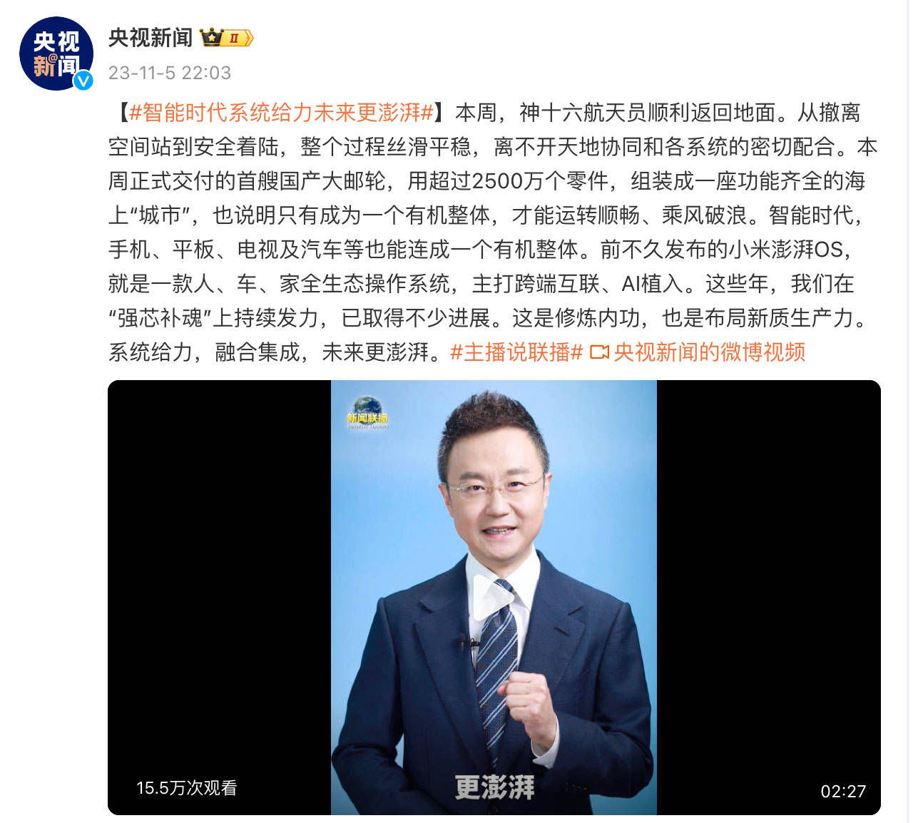 最近国产手机频频登陆央视节目,先是为华为Mate 60争气机点赞,前日又给小米澎湃OS大气。央视主持人还表示:这些年我们在“强芯补魂”上,持续发力,已经取得了不少进展,这是修炼内功,也是布局新质生产力。系统给力,融合集成,未来更澎湃!