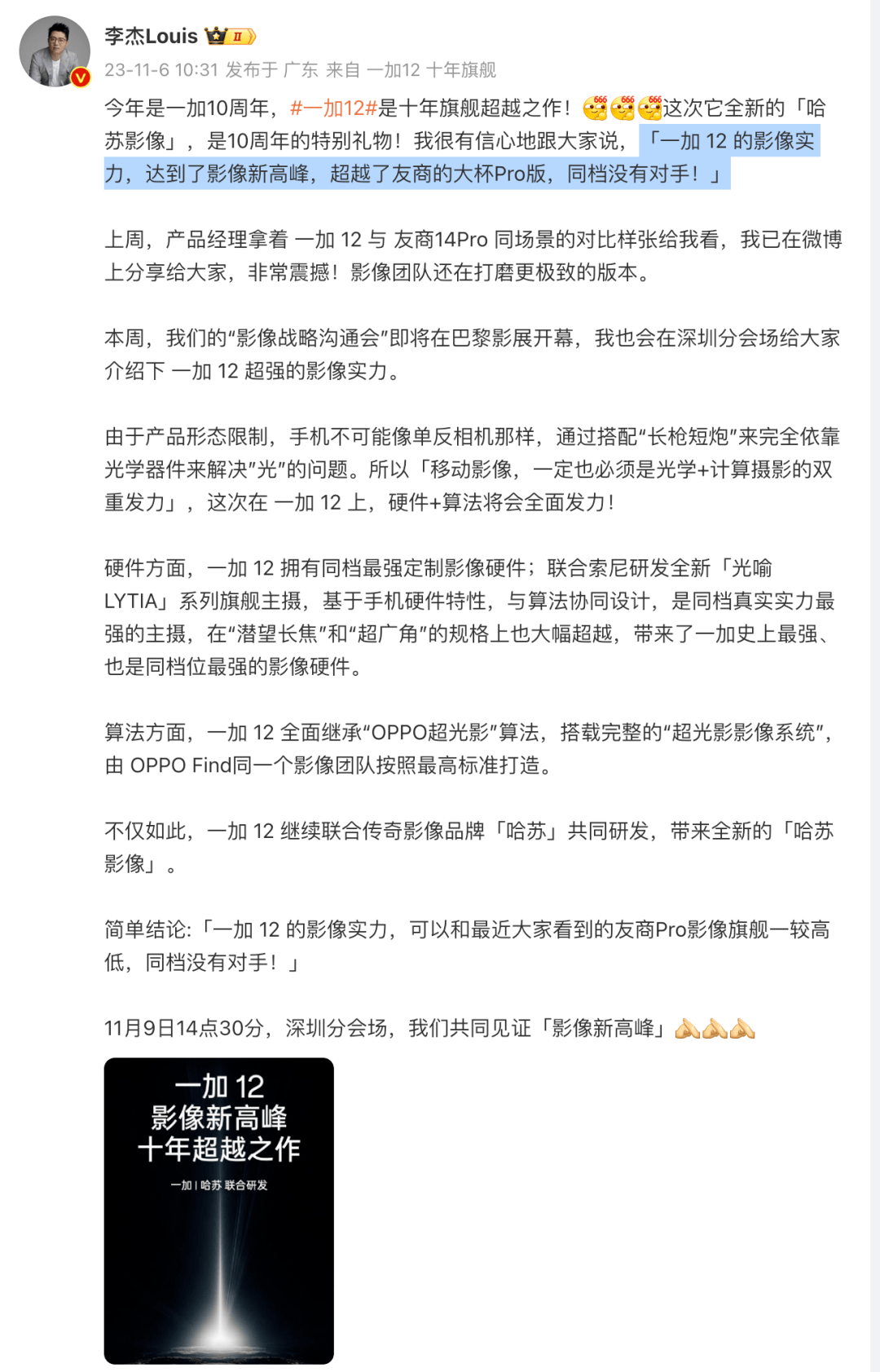 上个月一加12预热将首批搭载骁龙8 Gen3处理器,全球首发2K顶级东方屏,将于11月发布,但目前一加12发布会日期暂时还没有具体消息,不过官方预热了一个影像活动。