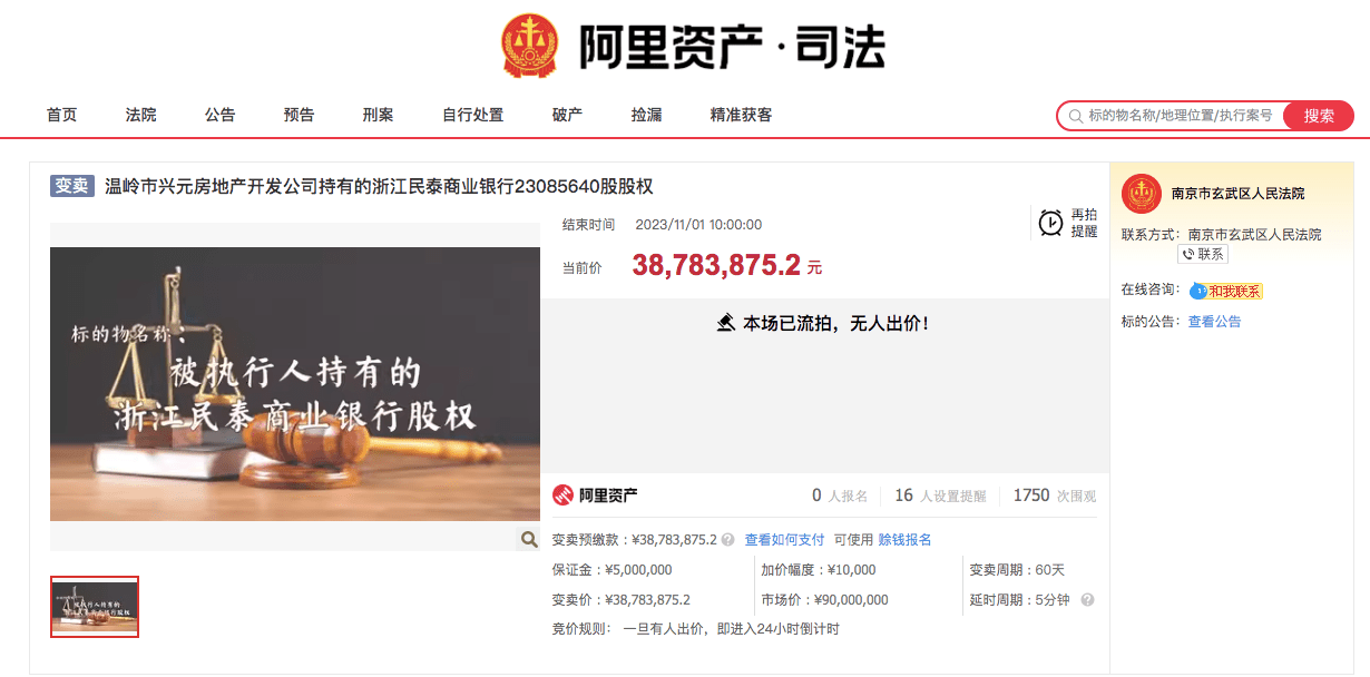 而这并不是该行股权首次流拍。蓝鲸财经记者注意到,南京市玄武区人民法院曾于5月29日第一次拍卖兴元房地产所持有的民泰银行3000万股股权,起拍价6300万元,折合2.10元/股,较市场价打7折,最终流拍。