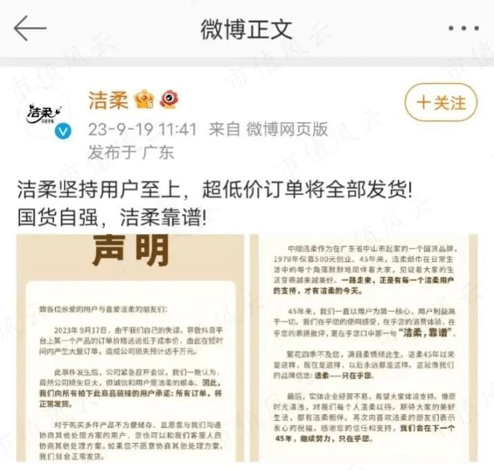 近日,洁柔直播间输错价格致亏损千万导致洁柔登上热搜,再度翻红。随后有顾客主动取消了“10元6箱”的订单。