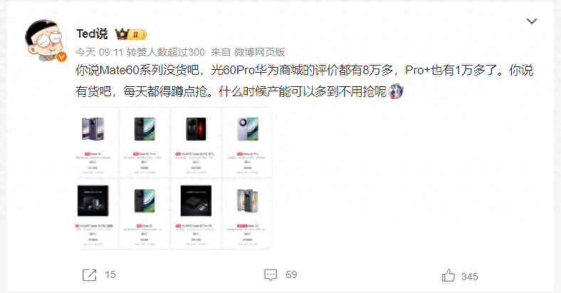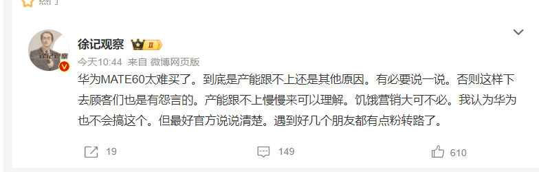 事实上,目前因为产能问题,也导致了不少消费者怨言,甚至已经有不少网友表示等不起,已经转投iPhone15阵营了,这导致了很多潜在的购机需求被流失了。笔者认为,华为或许需要在当前的情况下,或许需要向消费者解释清楚。