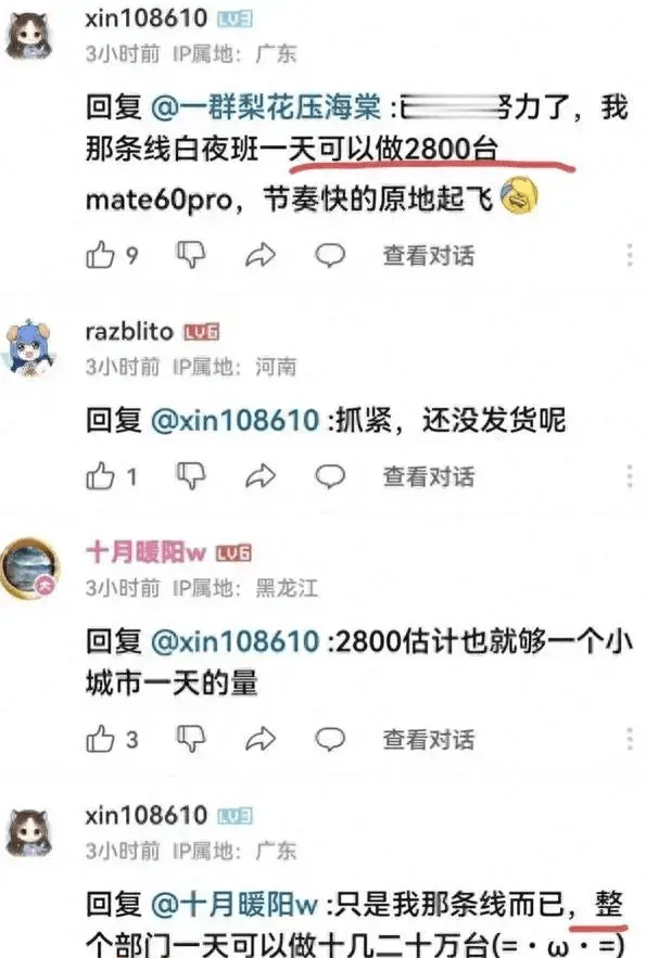 根据知情人透露,华为供应链工厂这几个月时间一直在招人,天天抓产量,但依然跟不上需求。中秋国庆都在继续加班赶产量。华为mate60组装产能不够,流水线50秒出一台手机,24小时不停,按100条产线算每天17万台根本不够卖,目前亟待增加产线来应对庞大需求。