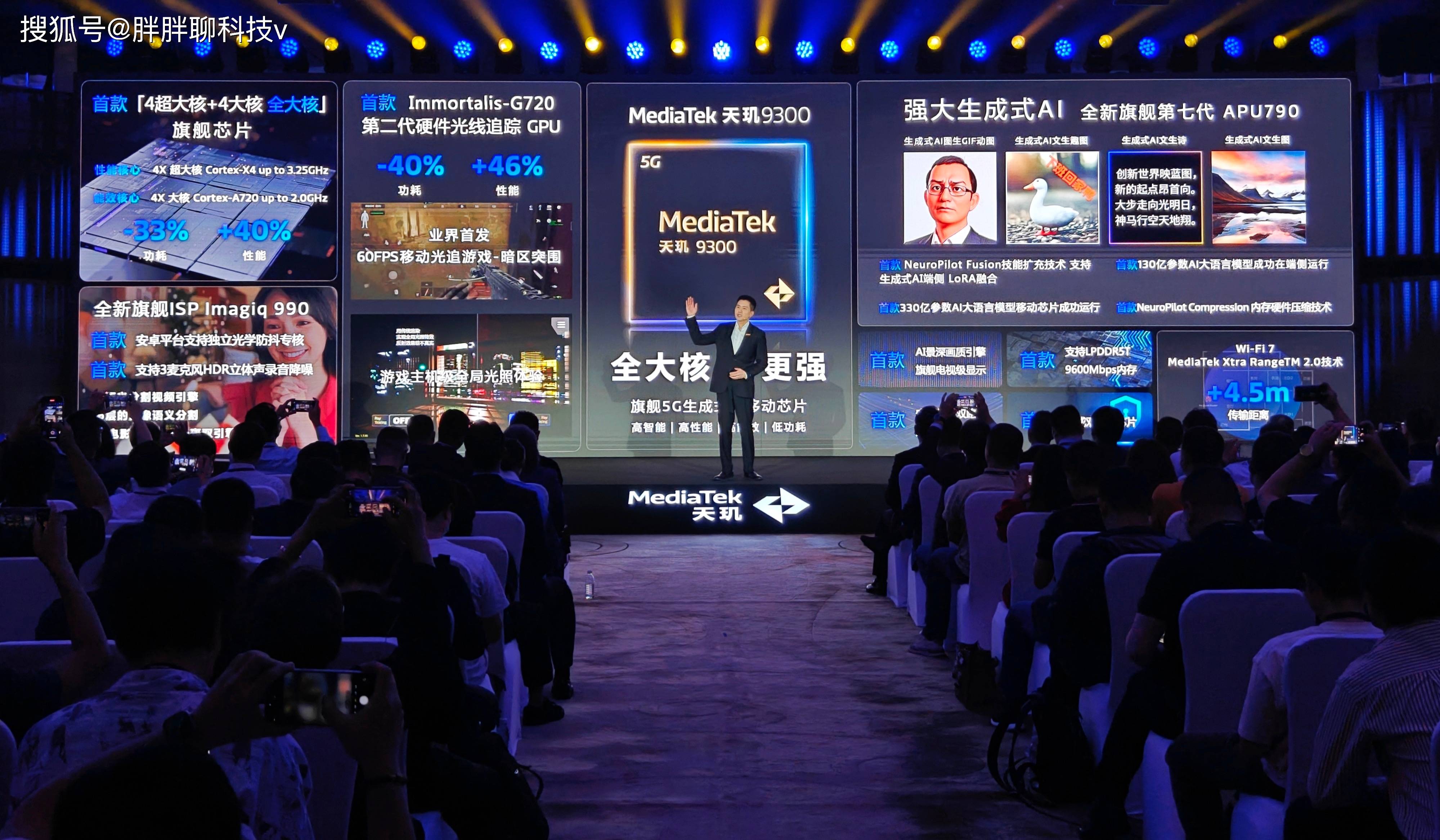 2023年11月6日,MediaTek联发科发布天玑9300旗舰5G生成式AI移动芯片。天玑9300采用台积电4nm工艺,采用“4超大核+4大核” “全大核”CPU架构,主频3.25GHz;搭载新一代旗舰12核GPU Immortalis-G720,第七代AI处理器APU 790。