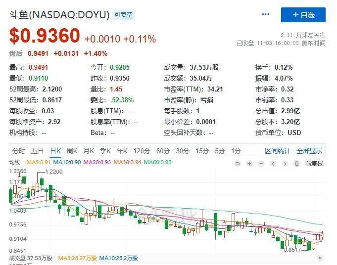 二级市场方面,截至11月4日收盘,斗鱼美股报收0.936美元,上涨0.11%。