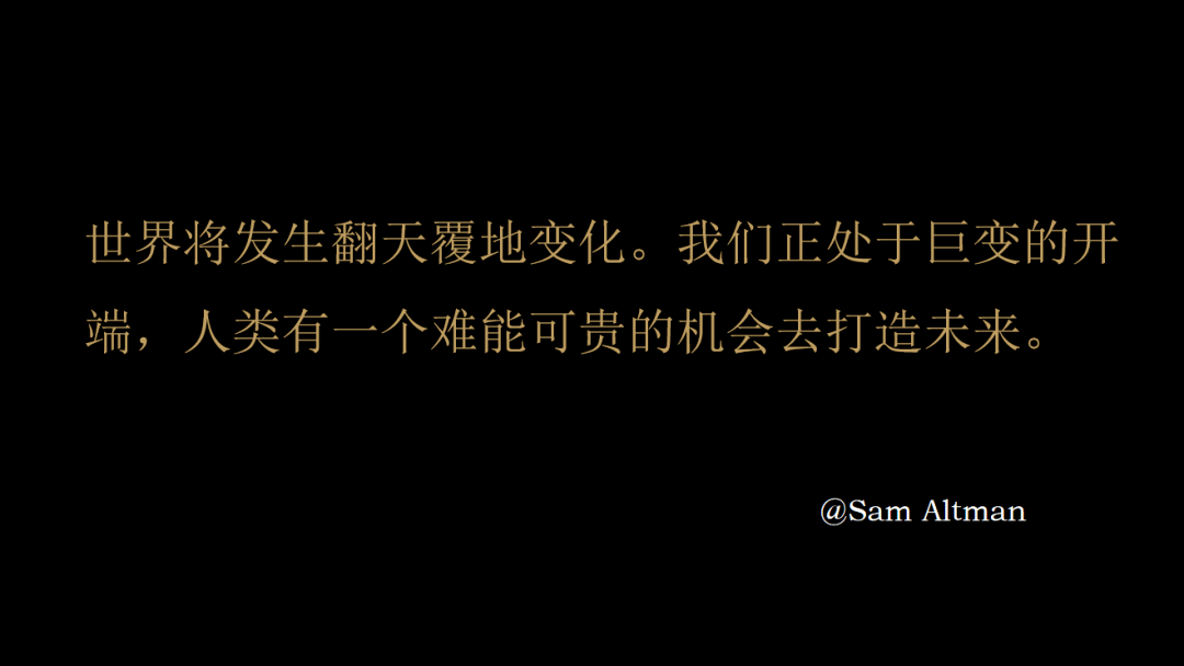 无论是R2-D2,无论是永生还是人类最终的消亡,这与大家都有密切的关系,值得每个人去思考,不仅仅是商业的机会,还包含人类的未来。我特别喜欢Sam Altman那句话:世界将发生翻天覆地变化。我们正处于巨变的开端,人类有一个难能可贵的机会去打造未来。