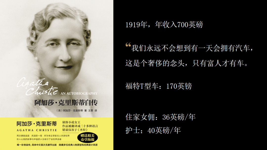 我们用一个例子来说明这个问题。阿加莎·克里斯蒂是作品销量达到全球前十的一位女性推理小说作者,而她在未出名之前,只是普通的英国中产阶级的一员,在1919年年收入是700英镑。她当时说,“我们永远想不到有一天会拥有汽车,这是一个奢侈的念头,只有富人才配拥有车。”