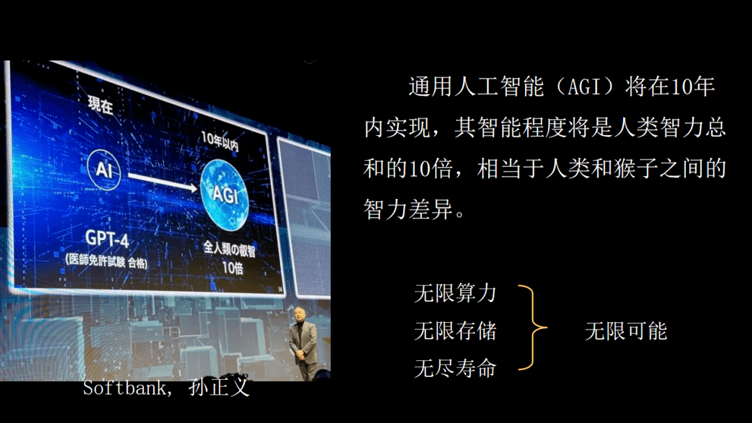 SoftBank的投资人孙正义不久前提出,通用人工智能(AGI)将在10年内实现,其智能程度将是人类智力总和的10倍,相当于人类和猴子之间的智力差异。他提到的只是AGI无限算力的一方面,它还拥有无限存储和无尽寿命,它代表的是无限的可能。