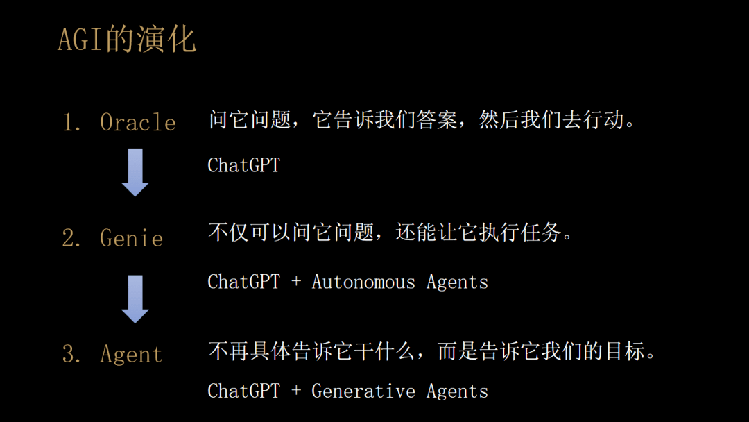 首先我们要梳理AGI的演化。第一阶段,ChatGPT,问它问题,它告诉我们答案,然后我们去行动;第二阶段,ChatGPT + Autonomous Agents,我们不仅可以问它问题,还能让它去执行任务;第三阶段,ChatGPT + Generative Agents,我们不再具体告诉它干什么,而是告诉它我们的目标。