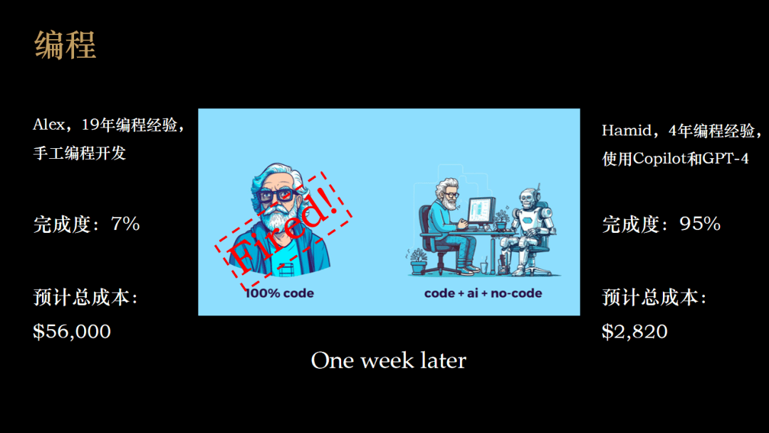有这样一个真实的测试,一家公司在相同的时间布置了相同的任务给两位程序员,其中Alex是一个具有16年编程经验的资深程序员,而另外一个人是只有4年编程经验的新手程序员。一周之后来检查他们完成的工作量时,发现资深程序员的完成度只有7%,而新手程序员已经完成了95%,因为这个经验较少的程序员使用了一个叫做Copilot的编程辅助工具。也正是因为如此,新手程序员的最终成本只有2800美元,而资深程序员预计总成本却要达到56000美元。于是资深程序员最终被淘汰。