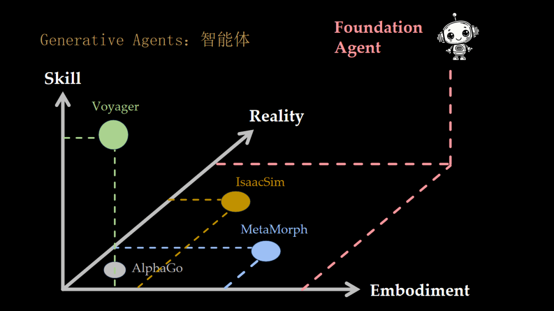 但是目前来说,它们只是占到这三个轴的两个轴而已,未来真正的智能体应该是这三个轴都非常厉害,我把它称为基座代理(Foundation Agent)。我们下一步需要做的,就是在基座大模型的基础上,把Embodiment这个轴加上。