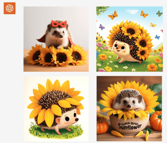 于是,ChatGPT就将这只“超级向日葵刺猬”画了出来,它没有简单地回答“我也不知道”,而是用图像的方式形象地将它展现出来,在这里我们可以看到很多具有创造性的元素。