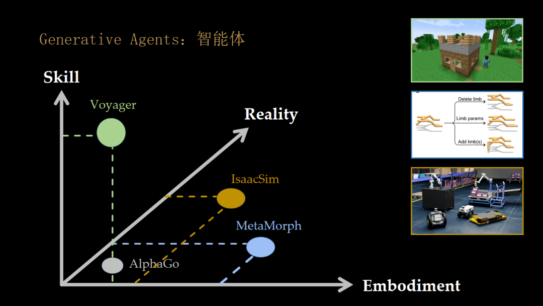 我们熟悉的AlphaGo,以上三个能力都不具备,它只能下围棋;智能体Voyager可以在一个空间内修房子、做各种各样的事,技能是很强的,但没有身体,也不具备与环境交互的能力;MetaMorph在丘陵里、山野里爬行,随着环境的改变而变化自己的形状,体现了与现实的交互;IsaacSim模拟我们自然环境里面的重力、摩擦力,试图创造出一个跟我们现实生活中一样的虚拟场景,先在里面
